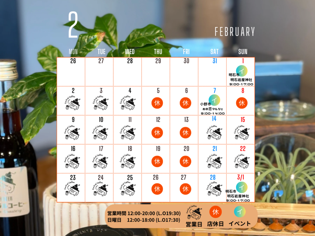 少しずつ寒さの中にも、春の気配を感じる2月。今月も、コーヒーのある時間をお届けします。2月1日は、毎月恒例明石・岩屋神社 おついたちまいりイベントに出店します。お参りのあと、ほっと一息つく一杯をぜひ。